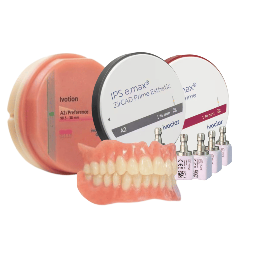 Trabaja con los mejores materiales como: IPS e.max CAD (vitrocerámica), IPS e.max ZirCAD (óxido de circonio), Ivotion (PMMA), Aleaciones y más.